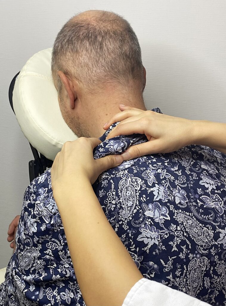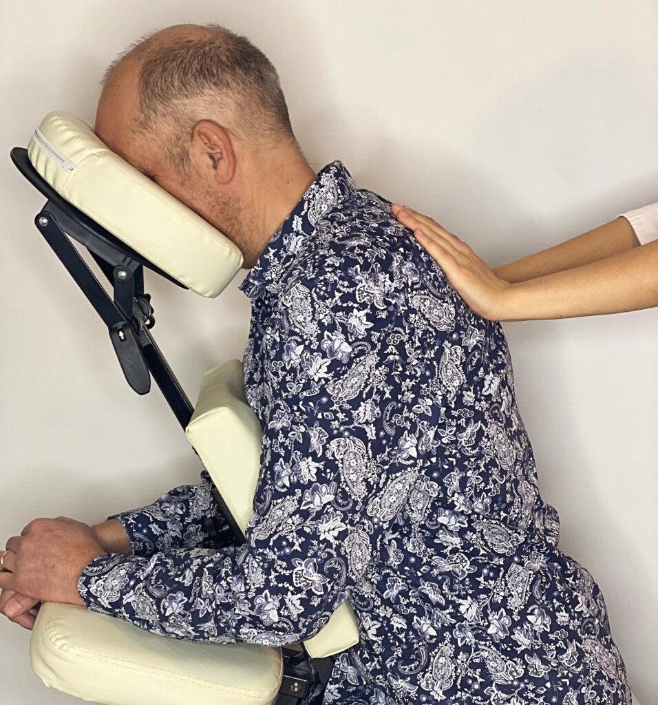 Stoelmassage vindt plaats op een speciaal ontworpen ergonomische stoel, terwijl je volledig gekleed blijft. Zonder olie en binnen 15 tot 20 minuten ervaar je een diepe ontspanning en voelbare verlichting van spieren en gewrichten. De massage is gebaseerd op de eeuwenoude Japanse Amma-Shiatsu acupressuurtechniek en aangepast aan de behoeften van onze moderne werkcultuur.